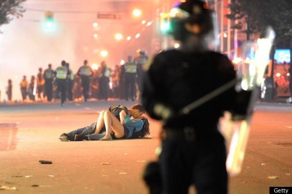 Surreal intimacy becomes an iconic photograph when a beaten down couple kiss under glowering lights in the center of the Vancouver riots. by Rich Lam / Getty ImagesImage Source June 25, 2011 -