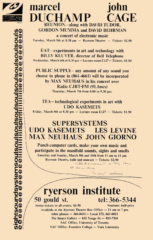 Unpublished poster of the meeting. This concert of electronic music was organized around a game of chess between Marcel Duchamp and John Cage at the Toronto Ryerson Institute (Cana..Image Source June 12, 2010 -