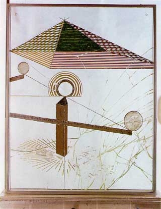 Marcel Duchamp, 1918 Oil paint, silver leaf, lead wire, and magnifying glasses on glass support(cracked), mounted between two glass panes ain a metal frame on a painted wood base,..Image Source January 27, 2010 -