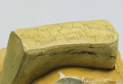 New York 1954. Plaster in two sections, partly painted. Detail reveals inscription: "Pour Sacha Maruchess [a dental technician who assisted in fabrication] tres cordialement."Image Source November 30, 2009 -