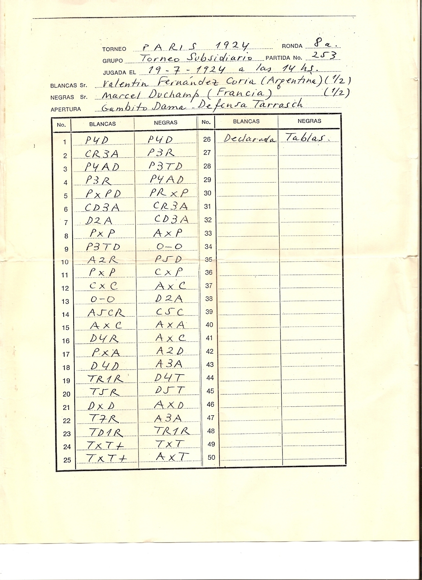 Transcription from the original document of each move made by the player: Marcel..