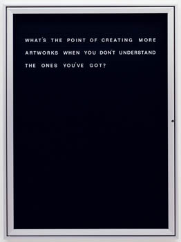 March 16, 2011 "Piss Off I'm A Fountain," read the eponymous "word vitrine" of Bethan Huws's 2008 London exhibition. The text was laid out in white-on-black on an announcement board, the kind you'd see at a post office or a university auditorium. It's actually kind of hilarious spoof on Duchamp's ultimate art-world spoof: the urinal that called itself a Fountain and put itself forward as art. The defiance of the statement "Piss off..." reminds me of the cri.. read more... -