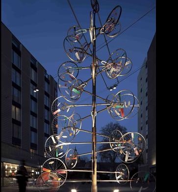 As one online commentator notes, “Duchamp must be ‘spinning’ in his grave” at the idea of 35 bicycle wheels reassembled in London’s Bermondsley Square. The designers hope to inspire more of the city’s residents to spin their own wheels instead of taking automotive transport.