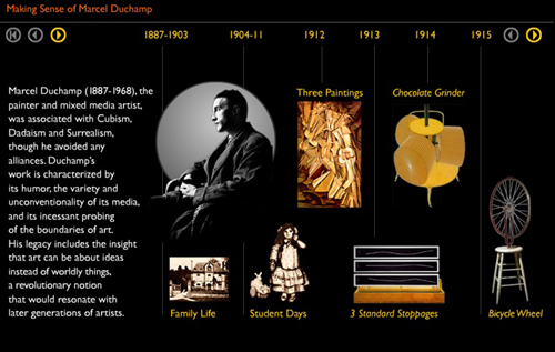 September 24, 2009UnderstandingDuchamp.com is an interactive approach to making sense of Duchamp. The website offers a detailed timeline of Duchamp’s life and work, with explanatory text and animations. This is a great educational resource for any Duchamp lover!