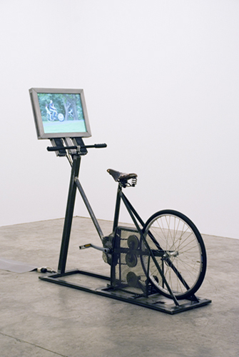I'd Give it to you if I could but I borrowed it, Guy Ben-Ner, 2007 (video installation) In order to view Guy Ben-Ner's video installation "I'd give it to you if I could but I borrowed it," the viewer must mount and "ride" one of the two stationary bicycles installed in the gallery. The video, displayed on a monitor mounted on the handlebars, is powered by pedaling the bicycle. The video depicts Ben-Ner and his two children stealing parts from famous art.. read more...