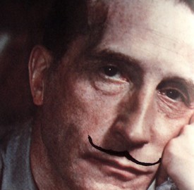 Vidal sardonically adorns a photo of Marcel Duchamp with a mustache and goatee reminiscent of Duchamp's own infamous L.H.O.O.Q. (1919).