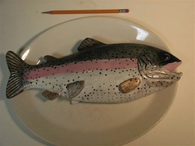 Fake Duchamp Fish on a Plate by Bill Duchamp-Schachter Duchamp-Schachter signed his work "Rrose Selavy 1921" at the bottom of the plate.