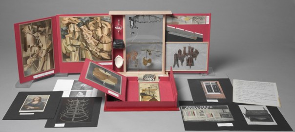 Red leather box containing 80 objects (collotype, letterpress, pouchoir, and lithographic prints; gouache, green lacquer, varnish, celluloid, wood; objects of glass, oilcloth, and ceramic)