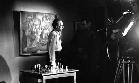 Marcel Duchamp, waiting for a cue from French Television during his exhibition at the Pasadena Art Museum in 1963. The film is “Un Jeu d’Echec avec Marcel Duchamp.”