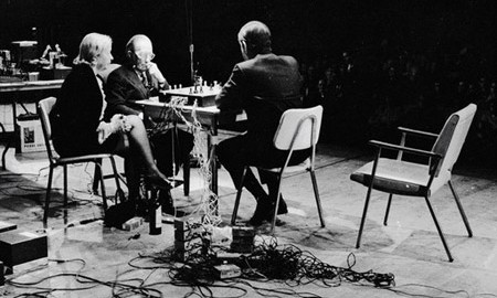 Teeny Duchamp and John Cage playing chess Marcel Duchamp, copyright Shigeko Kubota/ courtesy of Maya Stendhal Gallery , New York.